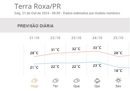 Apesar da alta temperatura a probabilidade de ocorrência de chuva na quinta-feira é de 97% com uma precipitação acumulada de 25.5 mm.