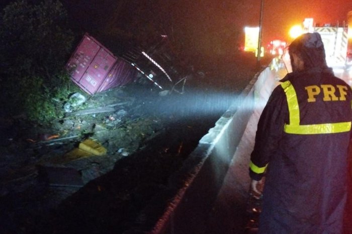Na noite de domingo (21), um grave acidente ocorreu no km 665 da BR 376, em Guaratuba (PR), envolvendo van, carreta contêiner e um veículo de passeio. Por volta das 21h40, a carreta, conduzida por um homem de 30 anos, teria perdido os freios, colidindo na traseira da van, que transportava 10 ocupantes.