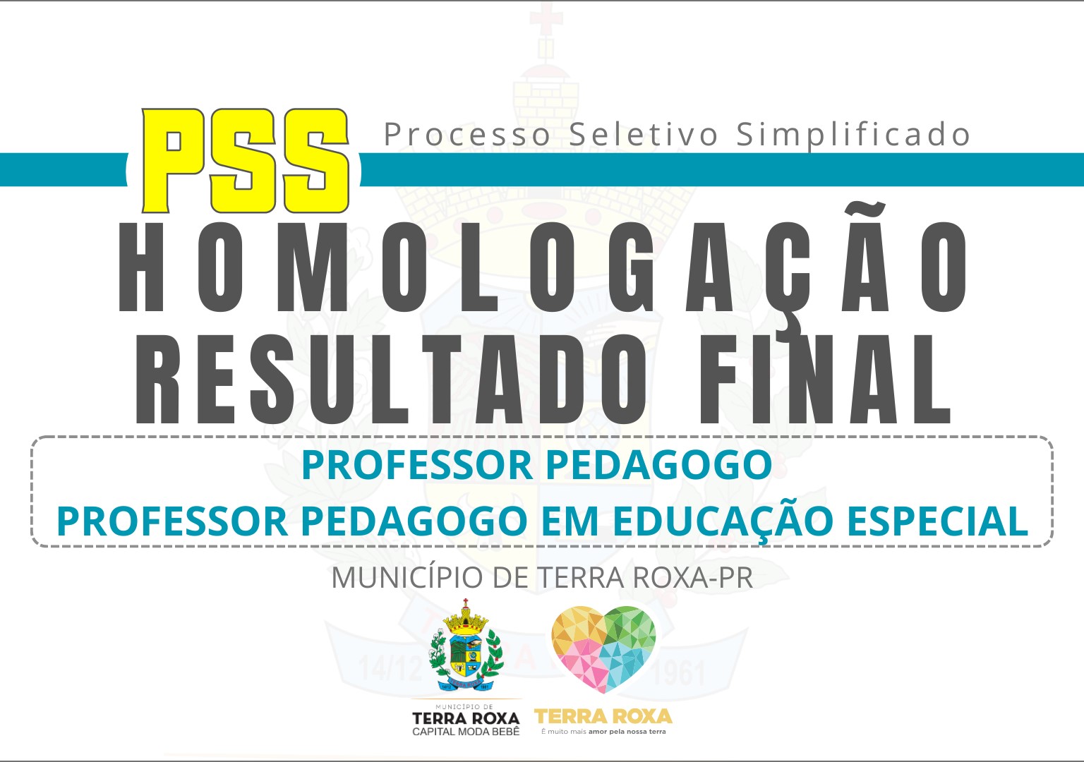 O Município de Terra Roxa e a Comissão Especial de Seleção do PSS N.° 002/2024, no uso de suas atribuições, tornam público aos interessados a HOMOLOGAÇÃO DO RESULTADO FINAL, para o cargo de PROFESSOR E PROFESSOR DE EDUCAÇÃO ESPECIAL, realizado neste Município.